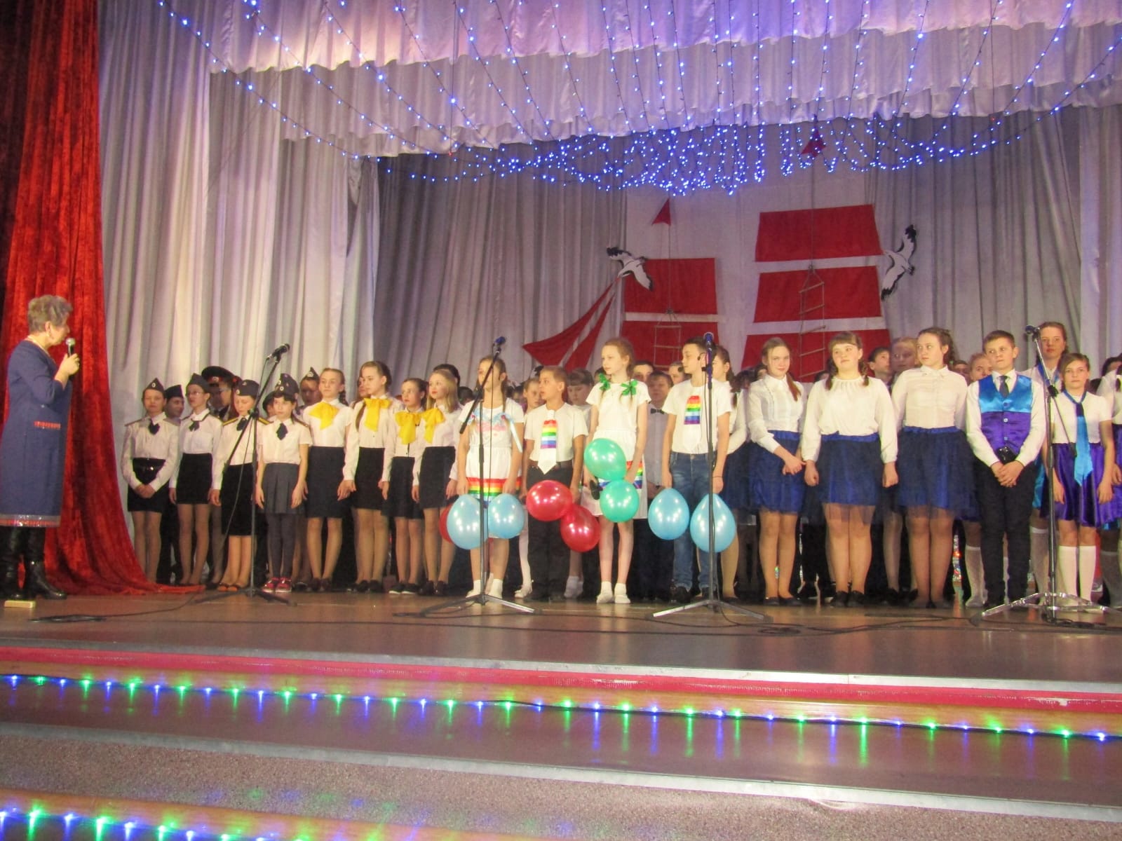 Школьный эстрадно-хореографический коллектив «Гармония» в составе сводного школьного хора на общешкольном мероприятии «Битва хоров»